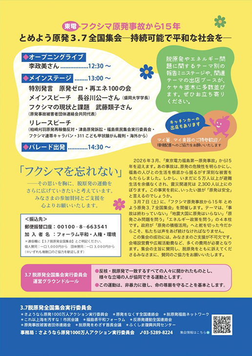 ![]() ![]() 東電フクシマ原発事故から15年とめよう原発! 3.7全国集会 〜持続可能で平和な社会を〜 | |