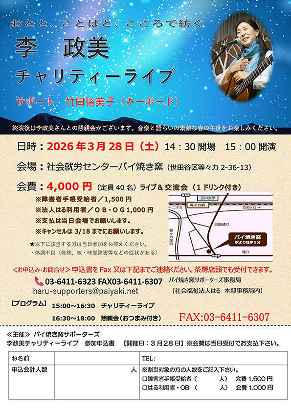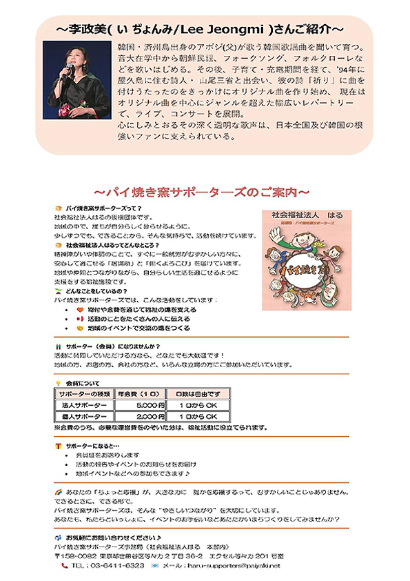 | 料金 | ライブ&交流会:4000円(1ドリンク付き) *定員40名 *法人はるメンバーは1000円/障害者手帳受給者は1500円 *お支払いは当日会場でお願いします。 *キャンセルは3/18までにお願いします。 |
