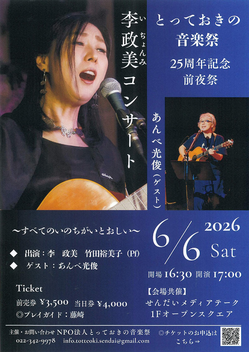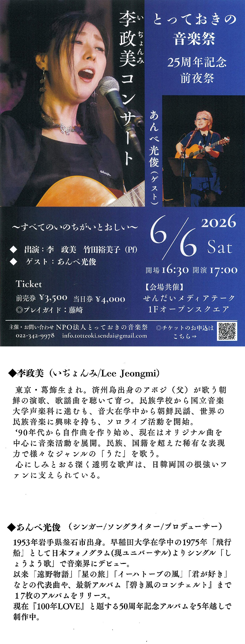| 日時・場所 | 6月7日(日) オープニング:13:55〜14:25(予定) 仙台駅前ペデストリアンデッキS-PAL前ステージ フィナーレ:勾当台公園滝前ステージ ※李政美は17:00~19:30の間で出演予定 |